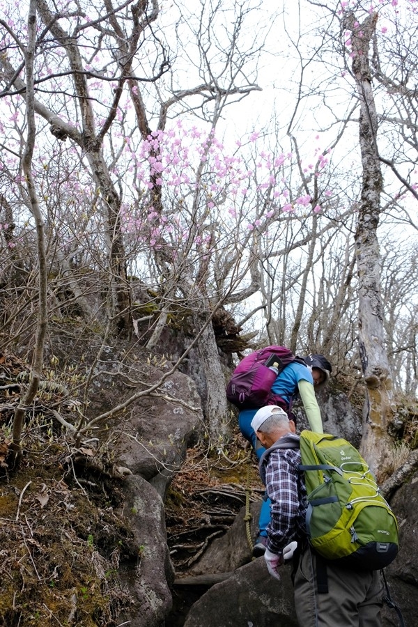 アカヤシオの下大きな岩をよじ登る