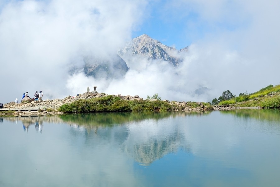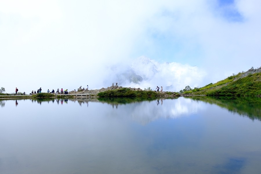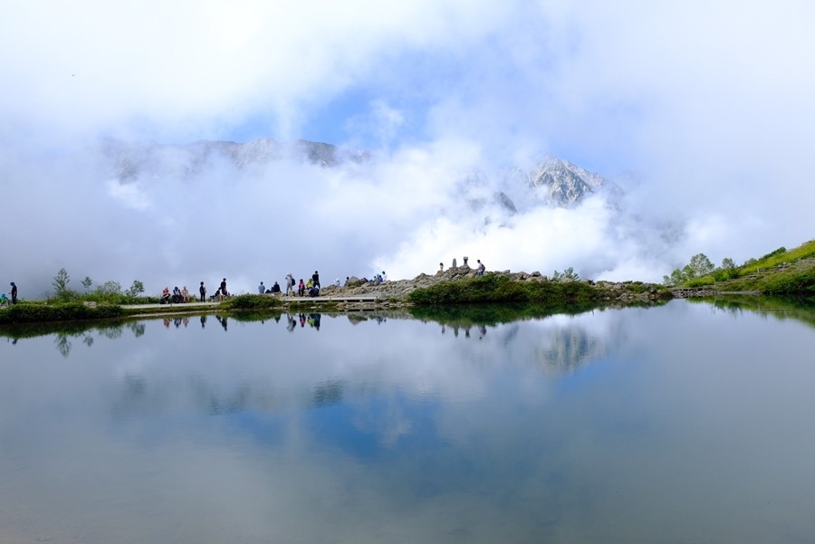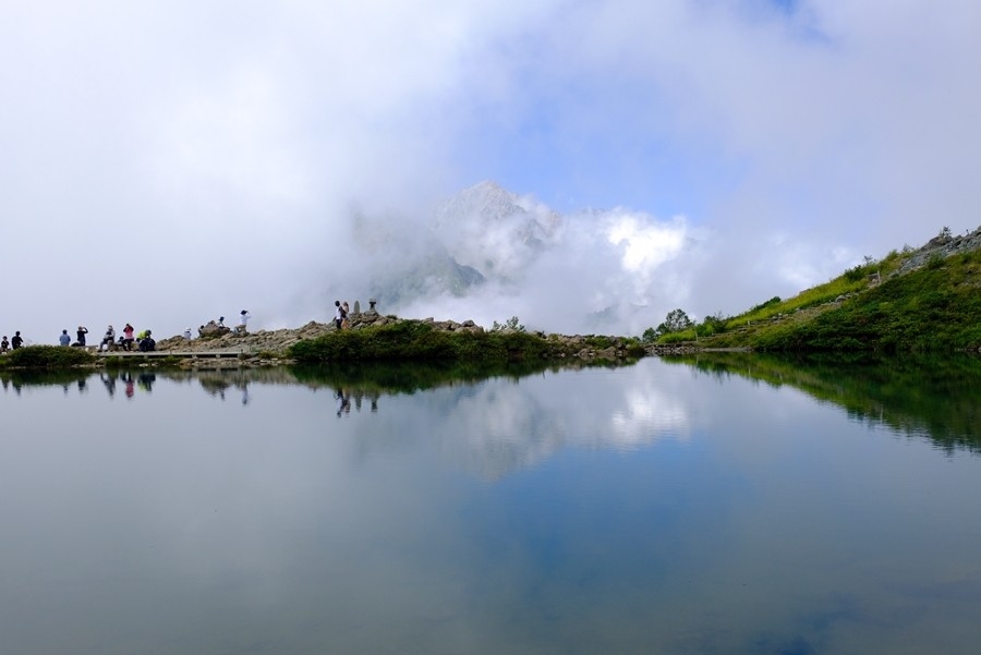 ガスが流れる合間に池に映る逆さ白馬三山を見る事が出来た。