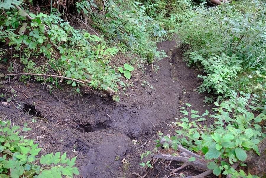 更に歩きにくい急斜面を登る。わらび平分岐の看板が上のほうに見えた。もう少し