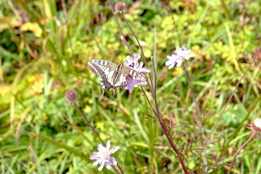 足元のマツムシソウに蝶々が止っている。羽がボロボロ