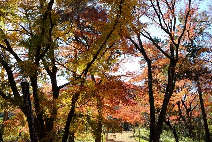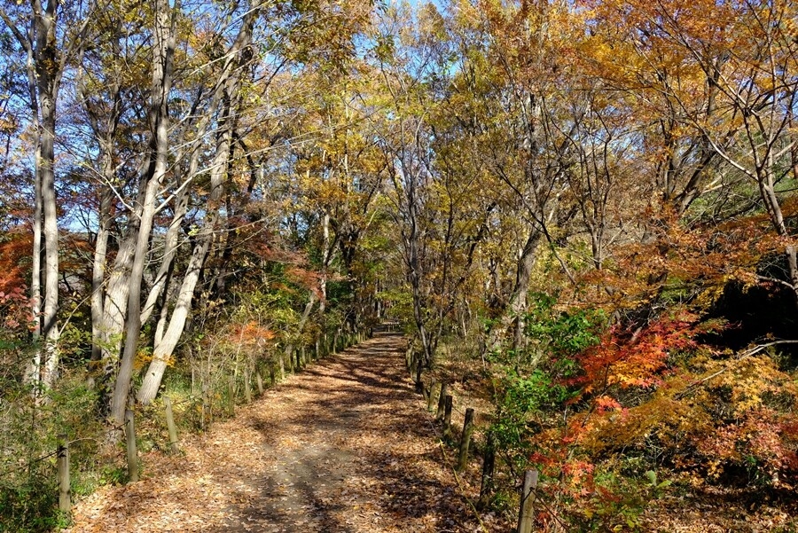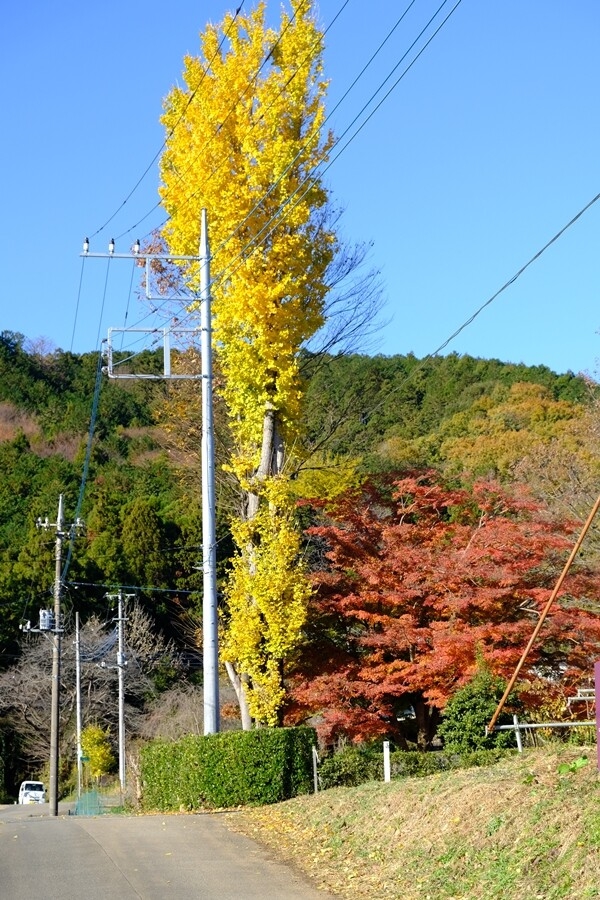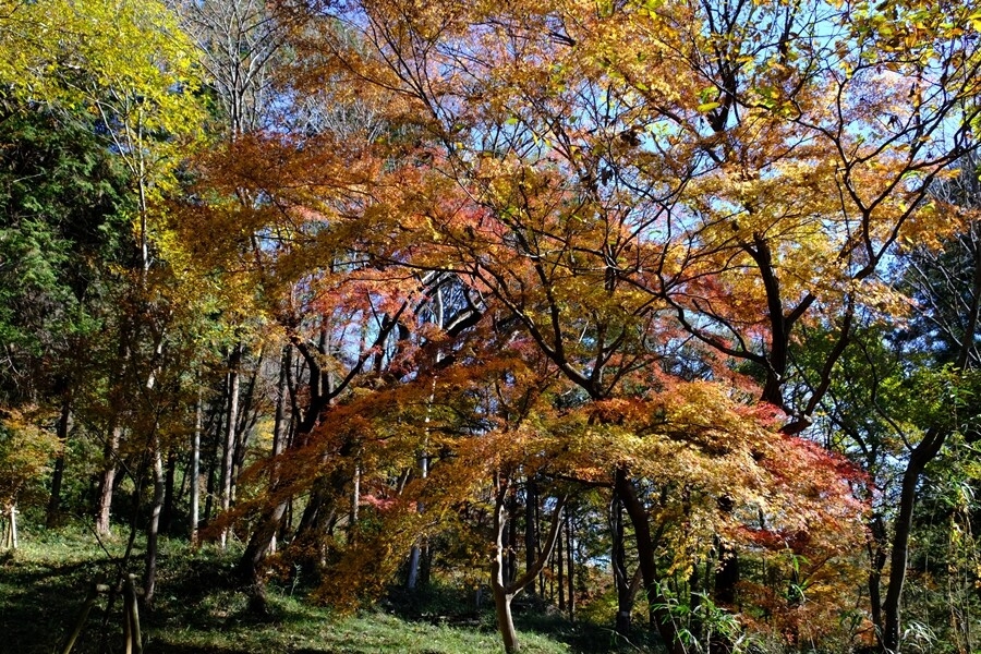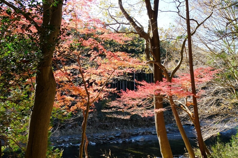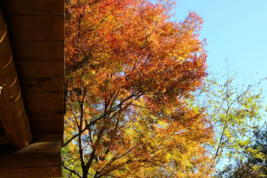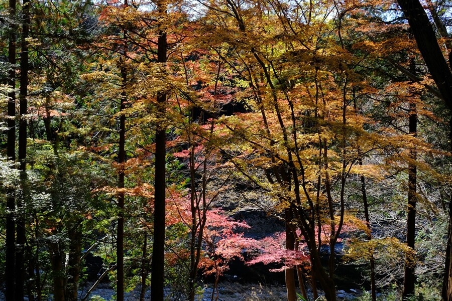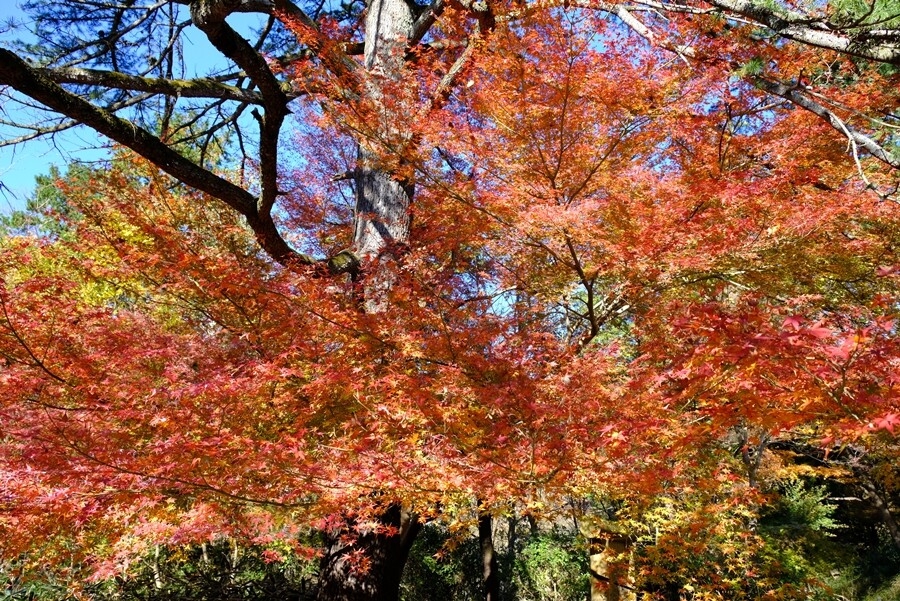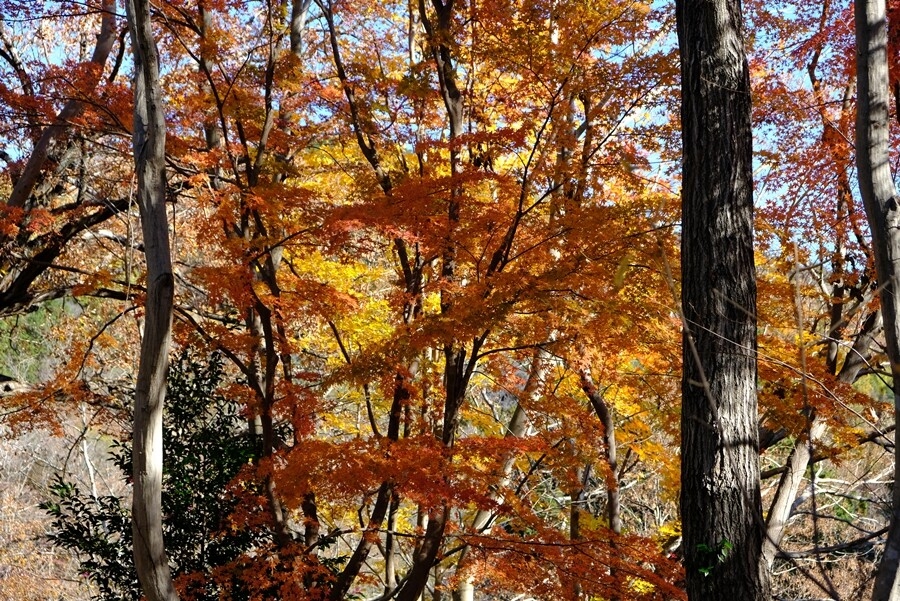 下る道沿いに楓の紅葉が多くなる。