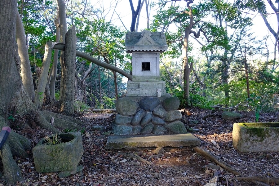 山頂手前の東屋が見えてきた。右へ山の神の案内があるので行ってみる。