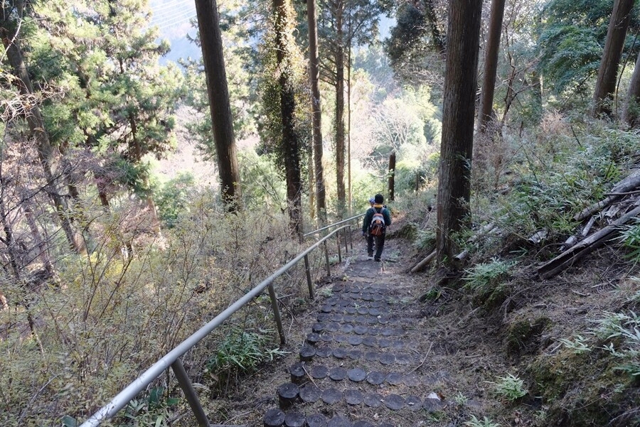 急な階段を下りる。