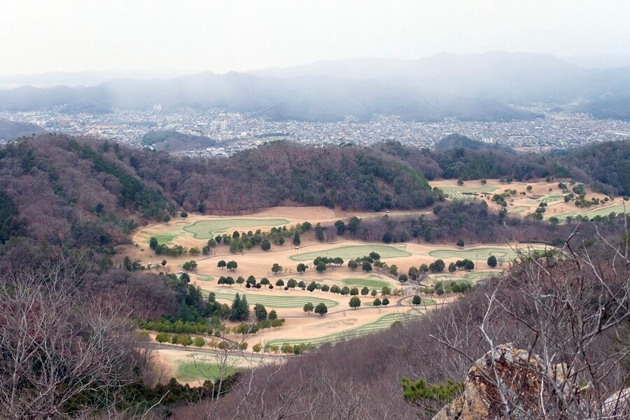 北側には綺麗に刈られた芝生模様がきれいなゴルフ場。空はしぐれている。