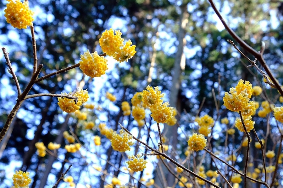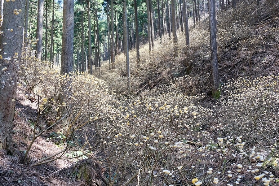 杉木立の斜面いっぱいにミツマタが咲いている。