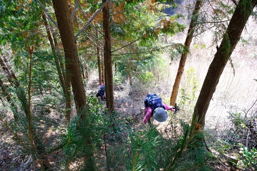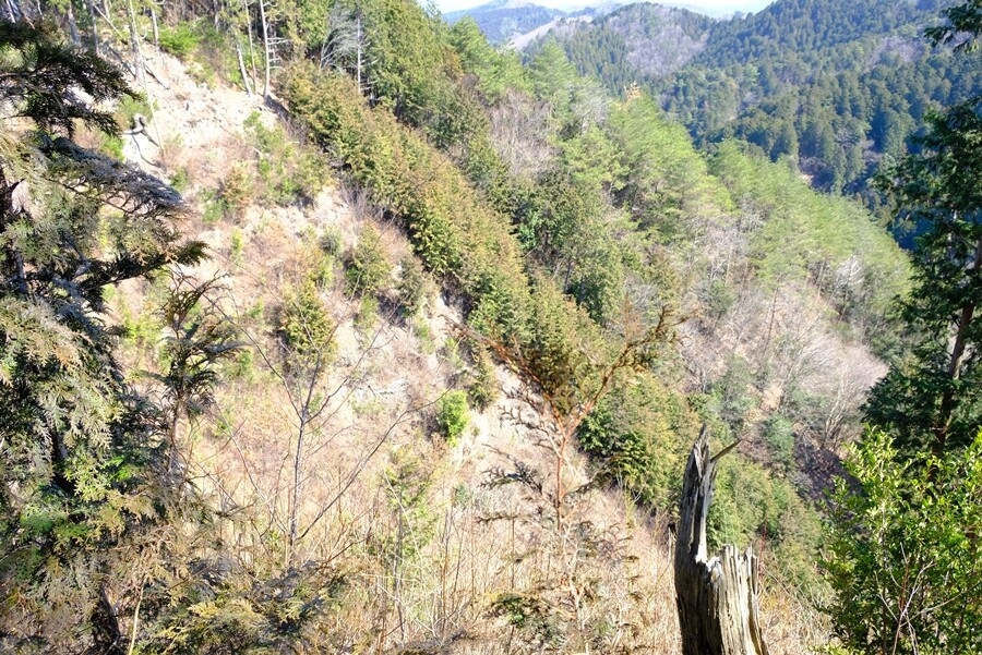 鶏足山方向に向かう途中で、苦労して登ってきた斜面を見返すとかなり急なことがわかる。