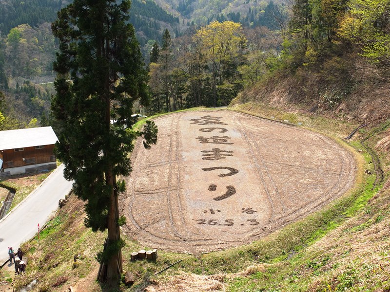 | 田んぼに書かれた文字 | 手形改めスタンプ地点 | 牛方宿(うしかたやど) | 馬がお食事中でした |