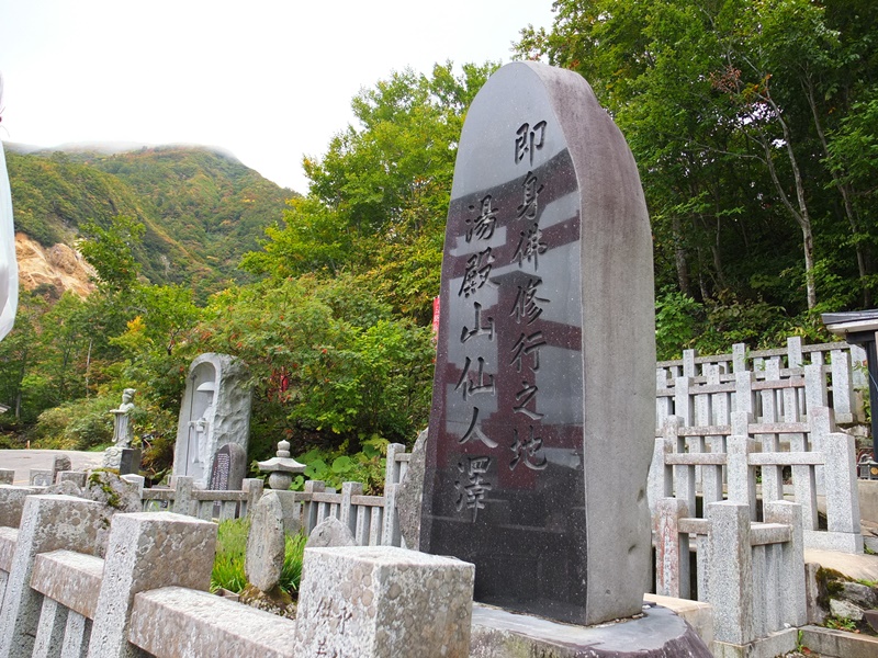 駐車場の右手にはお寺があります。修行して即身仏になったレプリカが置いてありました。