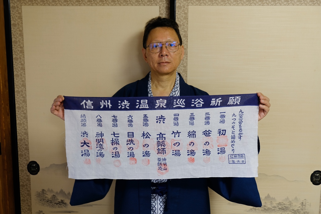 無事全湯制覇記念手ぬぐいを持って記念撮影