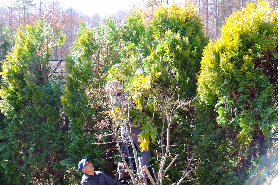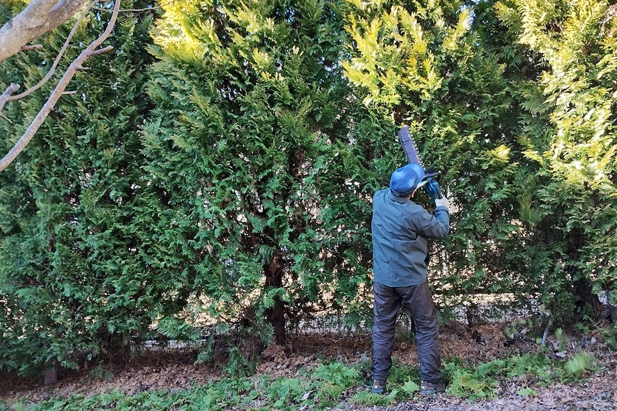 まず西側境の木をバリカンですっきり&先端中心に剪定を行います。