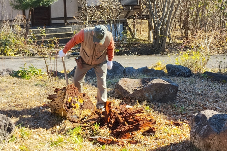 剪定が一段落したら、庭に転がっている丸太を粉砕します。